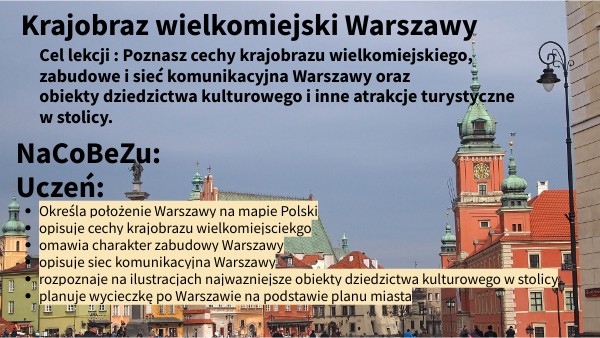 Cel lekcji : Poznasz cechy krajobrazu wielkomiejskiego, zabudowe i sieć komunikacyjna Warszawy oraz obiekty dziedzictwa kulturowego i inne atrakcje turystyczne w stolicy.