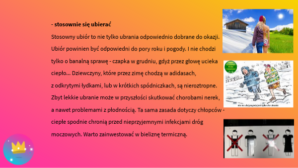 - stosownie się ubierać Stosowny ubiór to nie tylko ubrania odpowiednio dobrane do okazji. Ubiór powinien być odpowiedni do pory roku i pogody. I nie chodzi tylko o banalną sprawę - czapka w grudniu, gdyż przez głowę ucieka ciepło... Dziewczyny, które przez zimę chodzą w adidasach, z odkrytymi łydkami, lub w krótkich spódniczkach, są nieroztropne. Zbyt lekkie ubranie może w przyszłości skutkować chorobami nerek, a nawet problemami z płodnością. Ta sama zasada dotyczy chłopców - ciepłe spodnie chronią przed nieprzyjemnymi infekcjami dróg moczowych. Warto zainwestować w bieliznę termiczną.