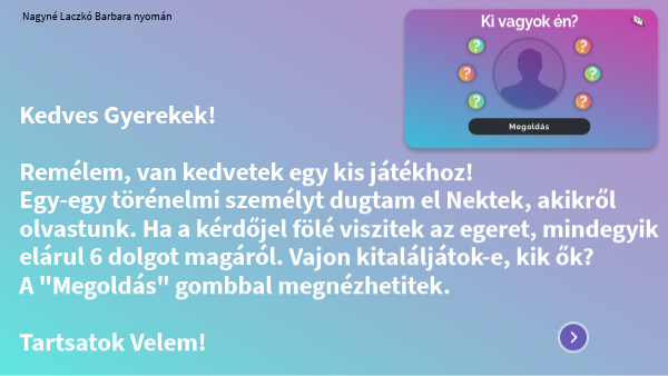 Kedves Gyerekek! Remélem, van kedvetek egy kis játékhoz! Egy-egy törénelmi személyt dugtam el Nektek, akikről olvastunk. Ha a kérdőjel fölé viszitek az egeret, mindegyik elárul 6 dolgot magáról. Vajon kitaláljátok-e, kik ők? A "Megoldás" gombbal megnézhetitek. Tartsatok Velem!