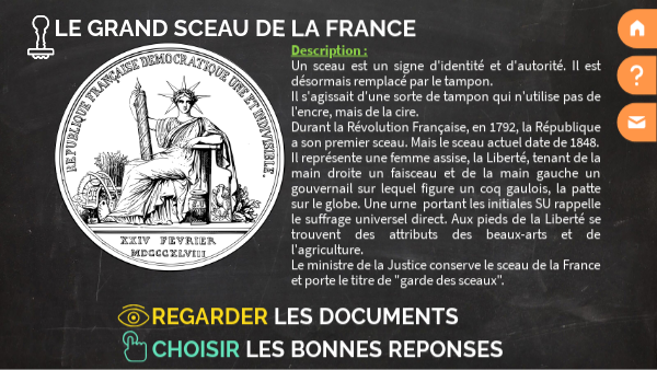 Description :Un sceau est un signe d'identité et d'autorité. Il est désormais remplacé par le tampon.Il s'agissait d'une sorte de tampon qui n'utilise pas de l'encre, mais de la cire.Durant la Révolution Française, en 1792, la République a son premier sceau. Mais le sceau actuel date de 1848.Il représente une femme assise, la Liberté, tenant de la main droite un faisceau et de la main gauche un gouvernail sur lequel figure un coq gaulois, la patte sur le globe. Une urne portant les initiales SU rappelle le suffrage universel direct. Aux pieds de la Liberté se trouvent des attributs des beaux-arts et de l'agriculture.Le ministre de la Justice conserve le sceau de la France et porte le titre de "garde des sceaux".