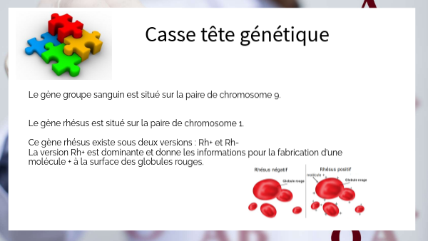 Le gène groupe sanguin est situé sur la paire de chromosome 9. Le gène rhésus est situé sur la paire de chromosome 1. Ce gène rhésus existe sous deux versions : Rh+ et Rh- La version Rh+ est dominante et donne les informations pour la fabrication d’une molécule + à la surface des globules rouges.