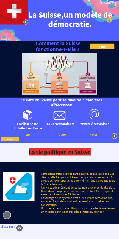 Cette démocratie est très participative, ce qui fait d'elle une démocratie très particulière en comparaison des autres. En effet les citoyens participe énormément à la vie politique de la Confédération. Il n'y a pas de président du pays, mais un/e président/e de la Confédération qui reste au pouvoir pendant 1an, et qui est élu/e par l'Assemblée Fédérale. L'avantage de ce système c'est qu'il est très démocratique, en revanche, la démocratie directe est structurellement conservatrice. Donc cette démocratie ultra-participative est-elle réellement un modèle pour les autres démocraties du Monde?