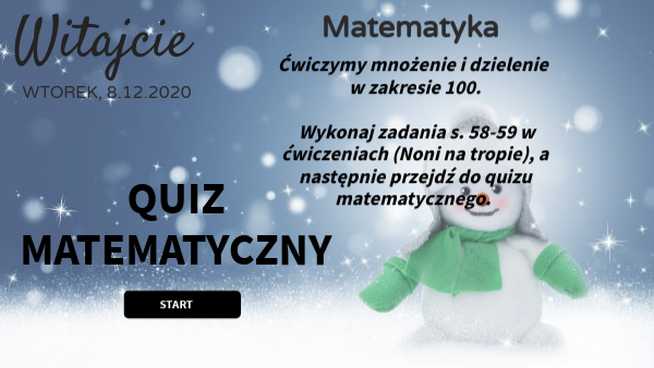 Ćwiczymy mnożenie i dzielenie w zakresie 100. Wykonaj zadania s. 58-59 w ćwiczeniach (Noni na tropie), a następnie przejdź do quizu matematycznego.