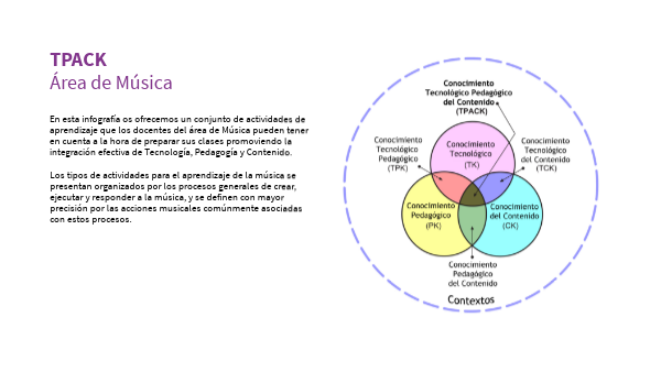 En esta infografía os ofrecemos un conjunto de actividades de aprendizaje que los docentes del área de Música pueden tener en cuenta a la hora de preparar sus clases promoviendo la integración efectiva de Tecnología, Pedagogía y Contenido.