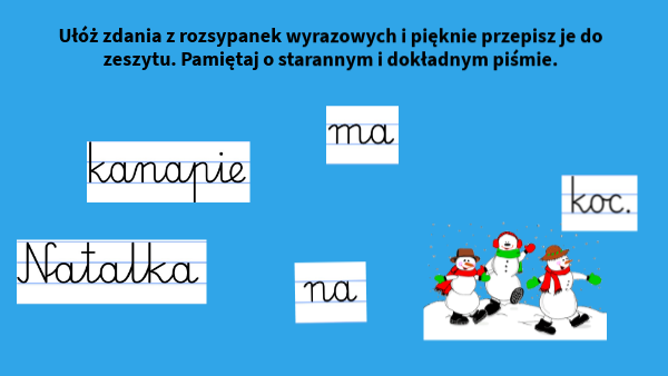 Ułóż zdania z rozsypanek wyrazowych i pięknie przepisz je do zeszytu. Pamiętaj o starannym i dokładnym pismie.