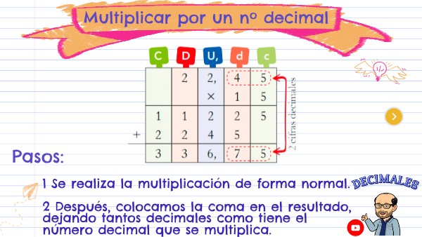 1 Se realiza la multiplicación de forma normal. 2 Después, colocamos la coma en el resultado, dejando tantos decimales como tiene el número decimal que se multiplica.