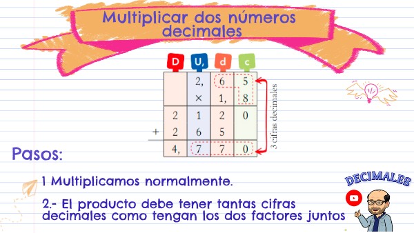 1 Multiplicamos normalmente. 2.- El producto debe tener tantas cifras decimales como tengan los dos factores juntos