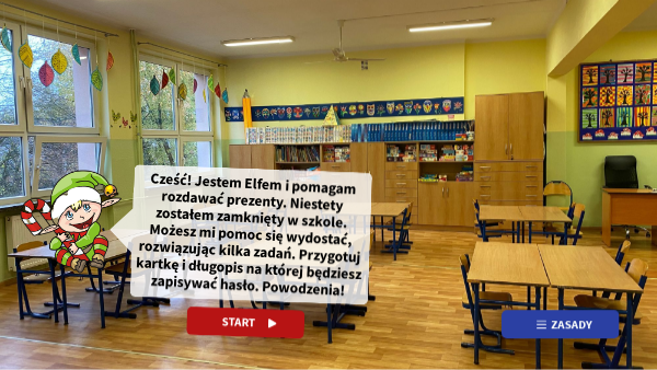 Cześć! Jestem Elfem i pomagam rozdawać prezenty. Niestety zostałem zamknięty w szkole.Możesz mi pomoc się wydostać, rozwiązując kilka zadań. Przygotuj kartkę i długopis na której będziesz zapisywać hasło. Powodzenia!