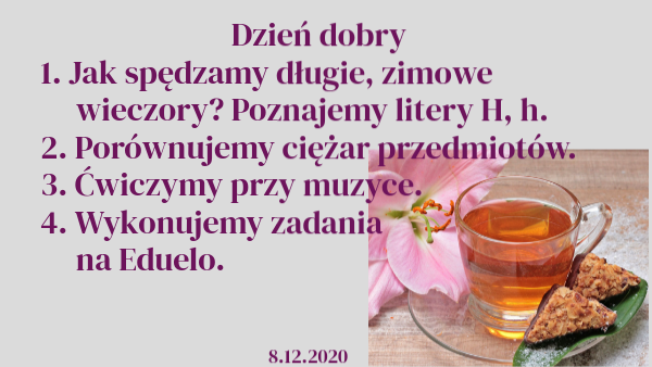 Dzień dobry 1. Jak spędzamy długie, zimowe wieczory? Poznajemy litery H, h.2. Porównujemy ciężar przedmiotów. 3. Ćwiczymy przy muzyce. 4. Wykonujemy zadania na Eduelo.