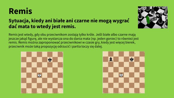 Sytuacja, kiedy ani białe ani czarne nie mogą wygrać dać mata to wtedy jest remis.