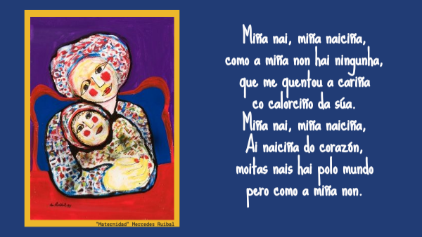 Miña nai, miña naiciña, como a miña non hai ningunha, que me quentou a cariña co calorciño da súa. Miña nai, miña naiciña, Ai naiciña do corazón, moitas nais hai polo mundo pero como a miña non.