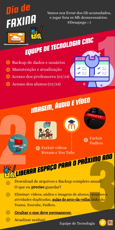 Eliminar: vídeos, aúdios e imagens de alunos, recursos e atividades duplicadas, aulas do arco-da-velha, links do Teams, Youtube, Padlets.
