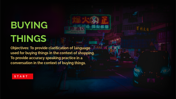 Objectives: To provide clarification of language used for buying things in the context of shopping. To provide accuracy speaking practice in a conversation in the context of buying things.