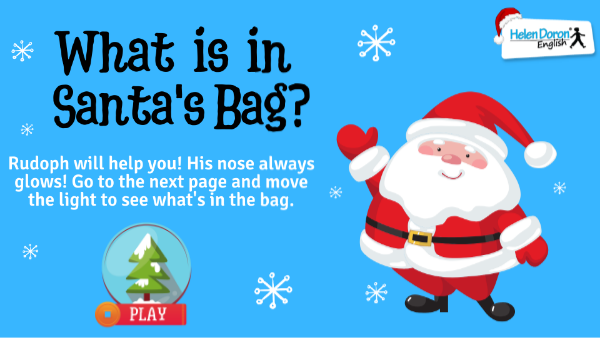 Move the reindeer to see what's in Santa's bag! Name everything you see!