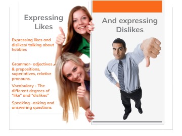 Expressing likes and dislikes/ talking about hobbies Grammar- adjectives & prepositions, superlatives, relative pronouns. Vocabulary - The different degrees of “like” and “dislikes” Speaking –asking and answering questions