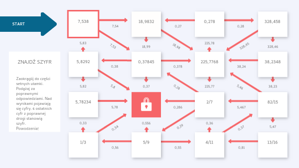 Zaokrąglij do części setnych ułamki. Podążaj za poprawnymi odpowiedziami. Nad wynikami pojawiają się cyfry. 6 ostatnich cyfr z poprawnej drogi stanowią szyfr. Powodzenia!