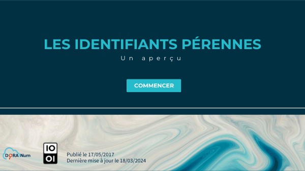 Les identifiants pérennes Objet sont assignés aux ressources issues de la production scientifique, par exemple les articles, les jeux de données, les images, les sons, les objets physiques... Il existe déjà des identifiants tels que l’ISBN pour les livres et l’ISSN pour les revues.Cependant, avec le déploiement d’internet et la mise en ligne de publications et de données de la recherche, des identifiants mieux adaptés à l’univers numérique ont été mis en place comme : • le DOI (Digital Object Identifier)• PURL (persitent URL)• ARK (Archive Resource Key)• ePIC (European Persistent Identifier Consortium).Les logiciels et leur utilisation constituent également un élément incontournable dans le processus de la recherche. Il existe un identifiant pérenne spécifique aux logiciels créé par Software Heritage : le PID SWHID.