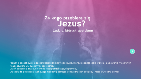 Poznanie sposobów realizacji miłości bliźniego wobec ludzi, którzy nie radzą sobie w życiu. Budowanie właściwych relacji z ludźmi wykluczonymi społecznie.Uczeń odnosi się z szacunkiem do ludzi potrzebujących pomocy. Otacza ludzi potrzebujących swoją modlitwą, starając się rozeznać ich potrzeby i nieść skuteczną pomoc.