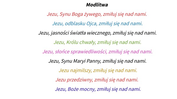 Modlitwa Jezu, Synu Boga żywego, zmiłuj się nad nami. Jezu, odblasku Ojca, zmiłuj się nad nami. Jezu, jasności światła wiecznego, zmiłuj się nad nami. Jezu, Królu chwały, zmiłuj się nad nami. Jezu, słońce sprawiedliwości, zmiłuj się nad nami. Jezu, Synu Maryi Panny, zmiłuj się nad nami. Jezu najmilszy, zmiłuj się nad nami. Jezu przedziwny, zmiłuj się nad nami. Jezu, Boże mocny, zmiłuj się nad nami.