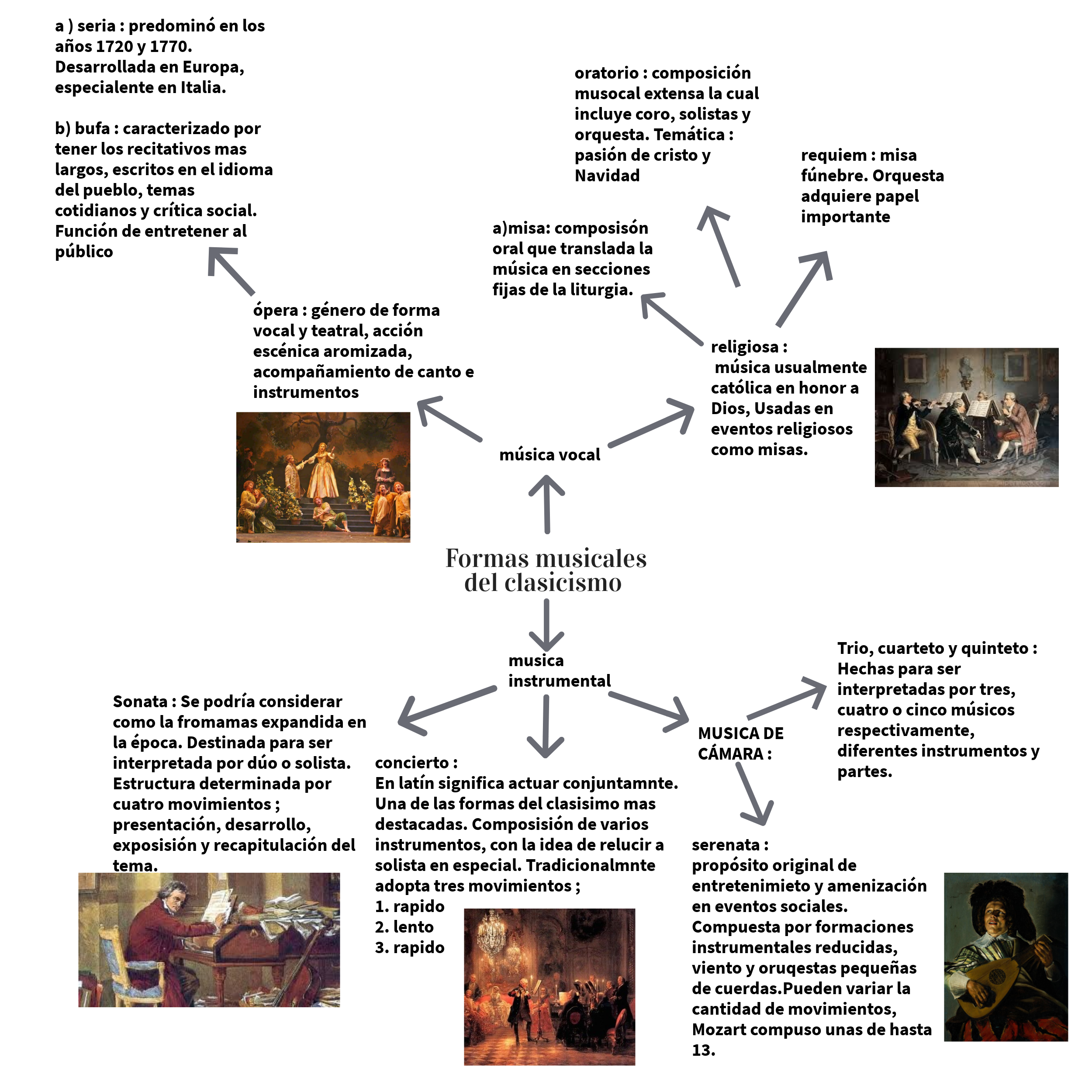 Sonata : Se podría considerar como la fromamas expandida en la época. Destinada para ser interpretada por dúo o solista. Estructura determinada por cuatro movimientos ; presentación, desarrollo, exposisión y recapitulación del tema.