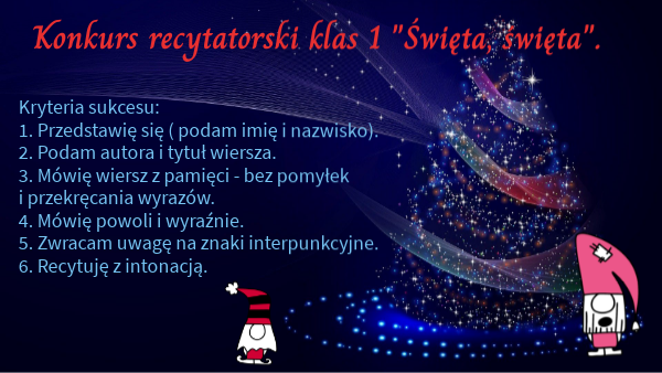 Kryteria sukcesu: 1. Przedstawię się ( podam imię i nazwisko). 2. Podam autora i tytuł wiersza. 3. Mówię wiersz z pamięci - bez pomyłek i przekręcania wyrazów. 4. Mówię powoli i wyraźnie. 5. Zwracam uwagę na znaki interpunkcyjne. 6. Recytuję z intonacją.