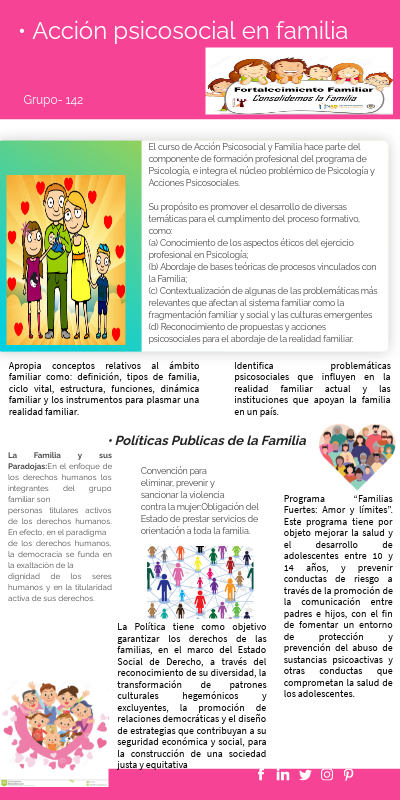 El curso de Acción Psicosocial y Familia hace parte del componente de formación profesional del programa de Psicología, e integra el núcleo problémico de Psicología y Acciones Psicosociales. Su propósito es promover el desarrollo de diversas temáticas para el cumplimento del proceso formativo, como: (a) Conocimiento de los aspectos éticos del ejercicio profesional en Psicología; (b) Abordaje de bases teóricas de procesos vinculados con la Familia; (c) Contextualización de algunas de las problemáticas más relevantes que afectan al sistema familiar como la fragmentación familiar y social y las culturas emergentes (d) Reconocimiento de propuestas y acciones psicosociales para el abordaje de la realidad familiar.