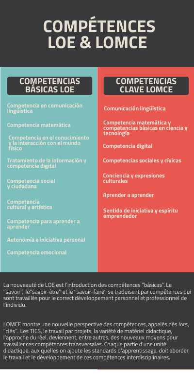 La nouveauté de LOE est l’introduction des compétences ‘’básicas’’. Le ‘’savoir’’, le‘’savoir-être’’ et le ‘’savoir-faire’’ se traduisent par compétences qui sont travaillés pour le correct développement personnel et professionnel de l’individu. LOMCE montre une nouvelle perspective des compétences, appelés dès lors, ‘’clés’’. Les TICS, le travail par projets, la variété de matériel didactique, l’approche du réel, deviennent, entre autres, des nouveaux moyens pour travailler ces compétences transversales. Chaque partie d’une unité didactique, aux quelles on ajoute les standards d'apprentissage, doit aborder le travail et le développement de ces compétences interdisciplinaires.