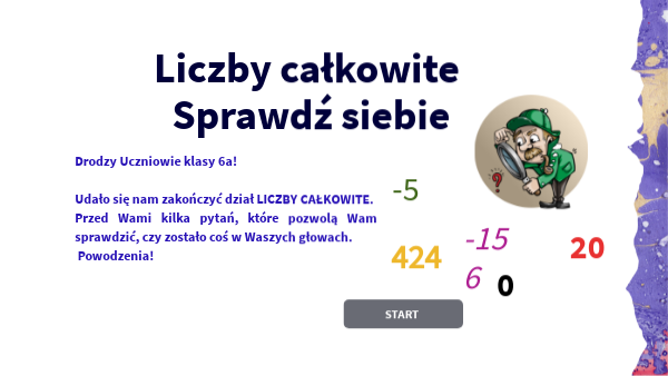 Drodzy Uczniowie klasy 6a! Udało się nam zakończyć dział LICZBY CAŁKOWITE. Przed Wami kilka pytań, które pozwolą Wam sprawdzić, czy zostało coś w Waszych głowach. Powodzenia!