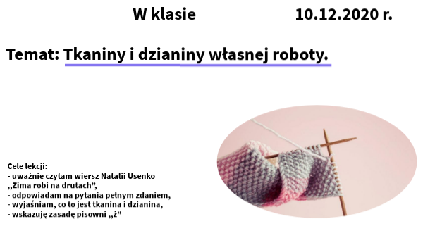W klasie 10.12.2020 r. Temat: Tkaniny i dzianiny własnej roboty.