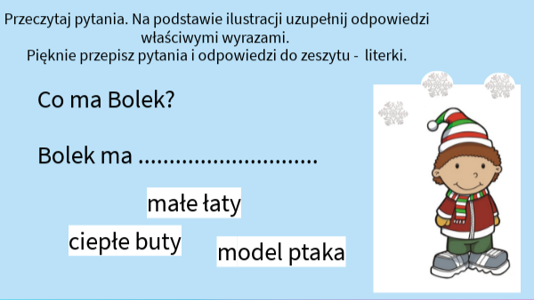 Przeczytaj pytania. Na podstawie ilustracji uzupełnij odpowiedzi właściwymi wyrazami. Pięknie przepisz pytania i odpowiedzi do zeszytu - literki.
