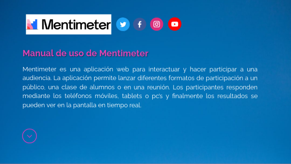 Mentimeter es una aplicación web para interactuar y hacer participar a una audiencia. La aplicación permite lanzar diferentes formatos de participación a un público, una clase de alumnos o en una reunión. Los participantes responden mediante los teléfonos móviles, tablets o pc’s y finalmente los resultados se pueden ver en la pantalla en tiempo real.