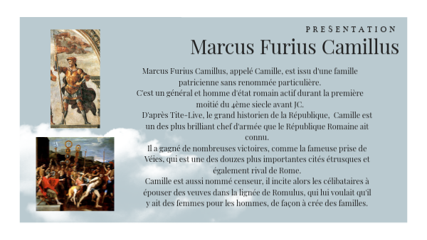 Marcus Furius Camillus, appelé Camille, est issu d'une famille patricienne sans renommée particulière.C'est un général et homme d'état romain actif durant la première moitié du 4ème siecle avant JC.D'après Tite-Live, le grand historien de la République, Camille est un des plus brilliant chef d'armée que le République Romaine ait connu. Il a gagné de nombreuses victoires, comme la fameuse prise de Véies, qui est une des douzes plus importantes cités étrusques et également rival de Rome. Camille est aussi nommé censeur, il incite alors les célibataires à épouser des veuves dans la lignée de Romulus, qui lui voulait qu'il y ait des femmes pour les hommes, de façon à crée des familles.