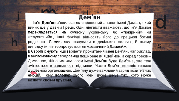 Ім’я Дем’ян з’явилося як спрощений аналог імені Даміан, який виник ще у давній Греції. Одні лінгвісти вважають, що ім’я Даміан перекладається на сучасну українську як «покірний» чи «слухняний». Інші фахівці відносять його до грецької богині родючості Дамии, яку шанували в декількох полісах. В цьому випадку ім’я інтерпретується як «освячений Дамией». В Європі існують інші варіанти прочитання імені Дем’ян. Наприклад, в англомовному середовищі поширене ім’я Деймон, а серед греків — Дамианос. Жіночим аналогом імені Дем’ян буде Дем’яна, яке теж змінюється в залежності від мови. Часто Дем’ян володіє тонкою душевною організацією. Дем’яну дуже важливий заряд позитивних емоцій. Тому володар цього імені дуже цінує тих, кого може назвати своїми друзями.