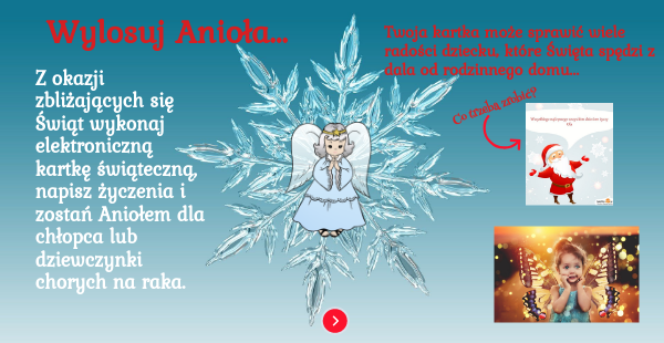 Z okazji zbliżających się Świąt wykonaj elektroniczną kartkę świąteczną, napisz życzenia i zostań Aniołem dla chłopca lub dziewczynki chorych na raka.