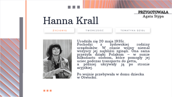 „Wielkim tematem Hanny Krall jest los człowieka uwikłanego w okrucieństwa historii, schwytanego w jej miażdżące mechanizmy, upodlonego i unicestwionego przez nią. Poza tym ta historia nie jest jakimś straszliwym abstraktem, ale ma postać konkretnej relacji człowieka do człowieka. Najczęściej, choć nie zawsze, relacji kata i ofiary”