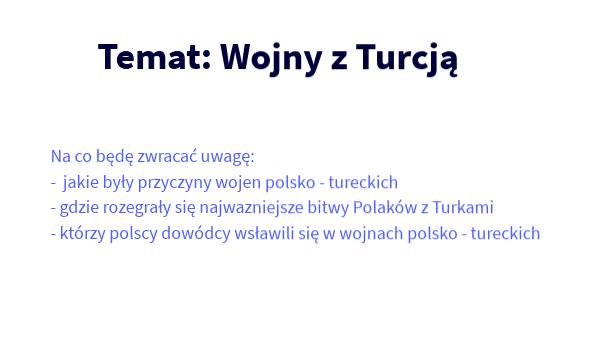 Na co będę zwracać uwagę:- jakie były przyczyny wojen polsko - tureckich - gdzie rozegrały się najwazniejsze bitwy Polaków z Turkami - którzy polscy dowódcy wsławili się w wojnach polsko - tureckich