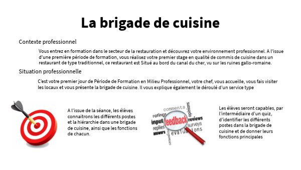 Les élèves seront capables, par l’intermédiaire d’un quiz, d’identifier les différents postes dans la brigade de cuisine et de donner leurs fonctions principales