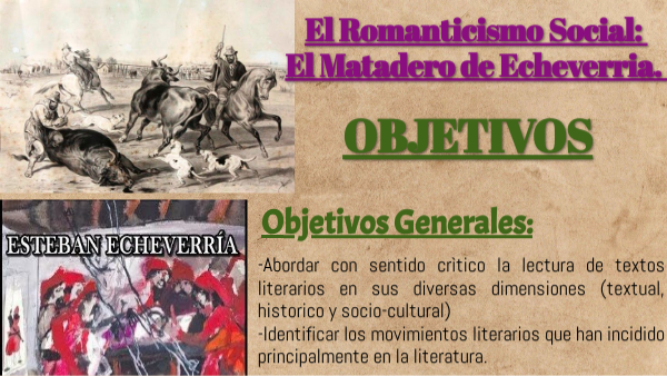 -Relacionar la concepcion Civilizacion y Barbarie en los textos literarios; El Matadero de Echeverria. -Interpretar el contexto de produccion de la obra. -Analizar la intertextualidad con la Cancion de los negros y la Presa de Kenzaburo Oe.