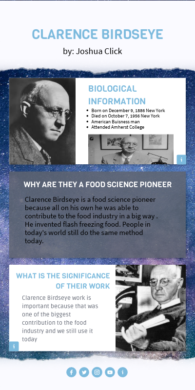 Clarence Birdseye is a food science pioneer because all on his own he was able to contribute to the food industry in a big way . He invented flash freezing food. People in today's world still do the same method today.