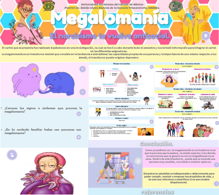 El cartel que se presenta fue realizado basándonos en una investigación, la cual se llevó a cabo durante todo el semestre y nos brindó información para integrar el cartel en las diferentes asignaturas.La megalomanía es un transtorno mental que consiste en la tendencia a sobrestimar las capacidades propias de una persona y la importancia de uno mismo respecto a los demás, el transtorno puede originar depresion.