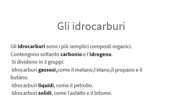 Gli idrocarburi sono i più semplici composti organici. Contengono soltanto carbonio e l’idrogeno. Si dividono in 3 gruppi: Idrocarburi gassosi,come il metano,l’etano,il propano e il butano. Idrocarburi liquidi, come il petrolio. Idrocarburi solidi, come l’asfalto e il bitume.