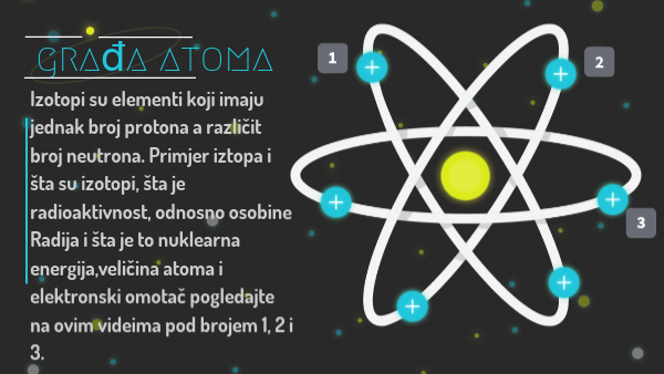 Izotopi su elementi koji imaju jednak broj protona a različit broj neutrona. Primjer iztopa i šta su izotopi, šta je radioaktivnost, odnosno osobine Radija i šta je to nuklearna energija,veličina atoma i elektronski omotač pogledajte na ovim videima pod brojem 1, 2 i 3.