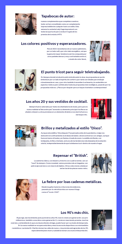 Para el 2021 necesitamos de un nuevo optimismo, por un lado naïf y por otro lado energético, así que la gama de mayor tendencia será la compuesta por unos pasteles densos y muy contrastados entre sí, a modo de color block,