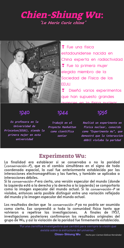 ❣ Fue una física estadounidense nacida en China experta en radiactividad. ❣ Fue la primera mujer elegida miembro de la Sociedad de Física de los EEUU. ❣ Diseñó varios experimentos que han supuesto grandes avances en la física nuclear.