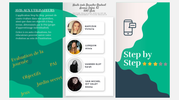 L'application Step by Step permet de s'auto-évaluer dans son quotidien, ainsi que dans ses objectifs à long terme, déterminés par le PEI (projet éducatif individualisé). Grâce à ces auto-évaluations, les éducateurs peuvent suivre votre évolution au sein de l'institution.