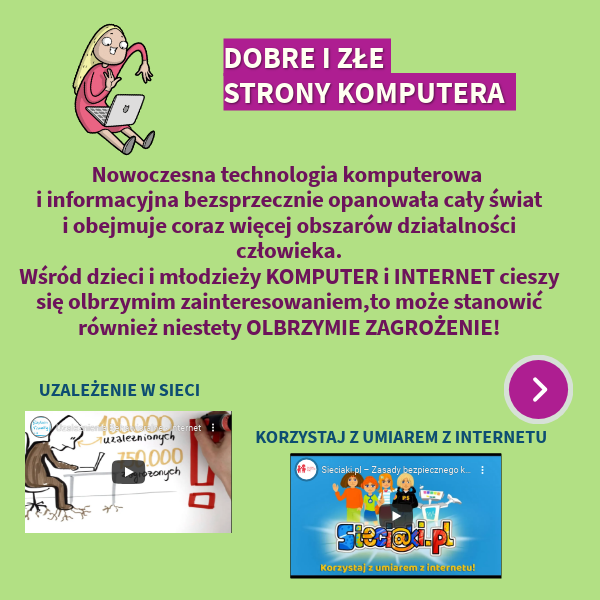 Nowoczesna technologia komputerowa i informacyjna bezsprzecznie opanowała cały świat i obejmuje coraz więcej obszarów działalności człowieka. Wśród dzieci i młodzieży KOMPUTER i INTERNET cieszy się olbrzymim zainteresowaniem,to może stanowić również niestety OLBRZYMIE ZAGROŻENIE!