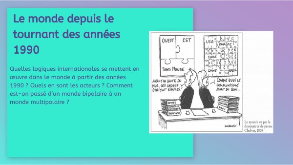 Quelles logiques internationales se mettent en œuvre dans le monde à partir des années 1990 ? Quels en sont les acteurs ? Comment est-on passé d’un monde bipolaire à un monde multipolaire ?