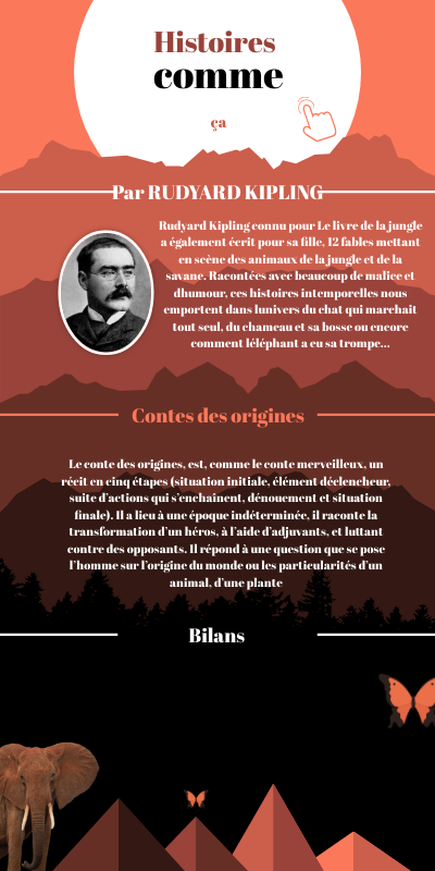 Rudyard Kipling connu pour Le livre de la jungle a également écrit pour sa fille, 12 fables mettant en scène des animaux de la jungle et de la savane. Racontées avec beaucoup de malice et dhumour, ces histoires intemporelles nous emportent dans lunivers du chat qui marchait tout seul, du chameau et sa bosse ou encore comment léléphant a eu sa trompe...