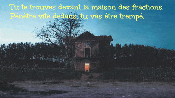 Tu te trouves devant la maison des fractions. Pénètre vite dedans, tu vas être trempé.
