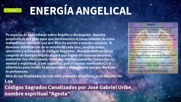 Tu espacio de aprendizaje sobre Ángeles y Arcángeles. Nuestro propósito es ser guía para que incrementes el conocimiento de estos maravillosos Seres de Luz que Dios ha puesto a nuestro servicio. Te daremos información de la misión de cada Uno, meditaciones, ejercicios y activación de Códigos Sagrados . Nuestra motivación es cargarte de Energía Angelical para que logres de manera amorosa, aumentar tus vibraciones, tener paz interior, sanar tu cuerpo físico, mental y espiritual, y por supuesto, que te sientas merecedor(a) y abierto(a) para recibir la prosperidad y abundancia que por Derecho te pertenecen.